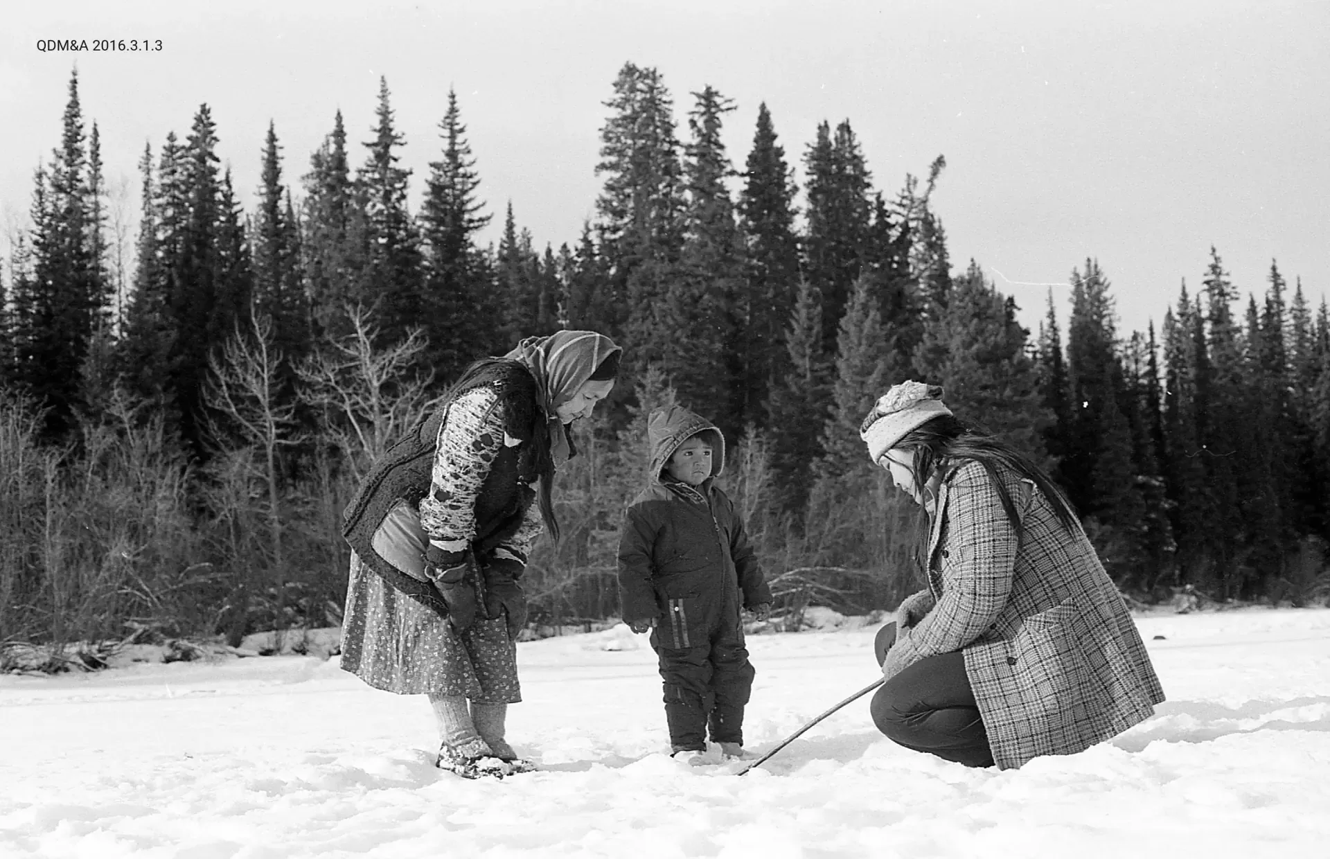 2016.3.1. 3 Ice fishing. Josie Paul was the wife of Antoine Baptiste. She is ice fishing at Beauty Creek with a young boy who might be her grandson Tory Baptiste, and her daughter Eva Baptiste (now Eva Gardner). Tory's mother died, and Josie and Eva raised him. This photo was labeled Alou Baptiste. Alou means grandmother in Dakelh.