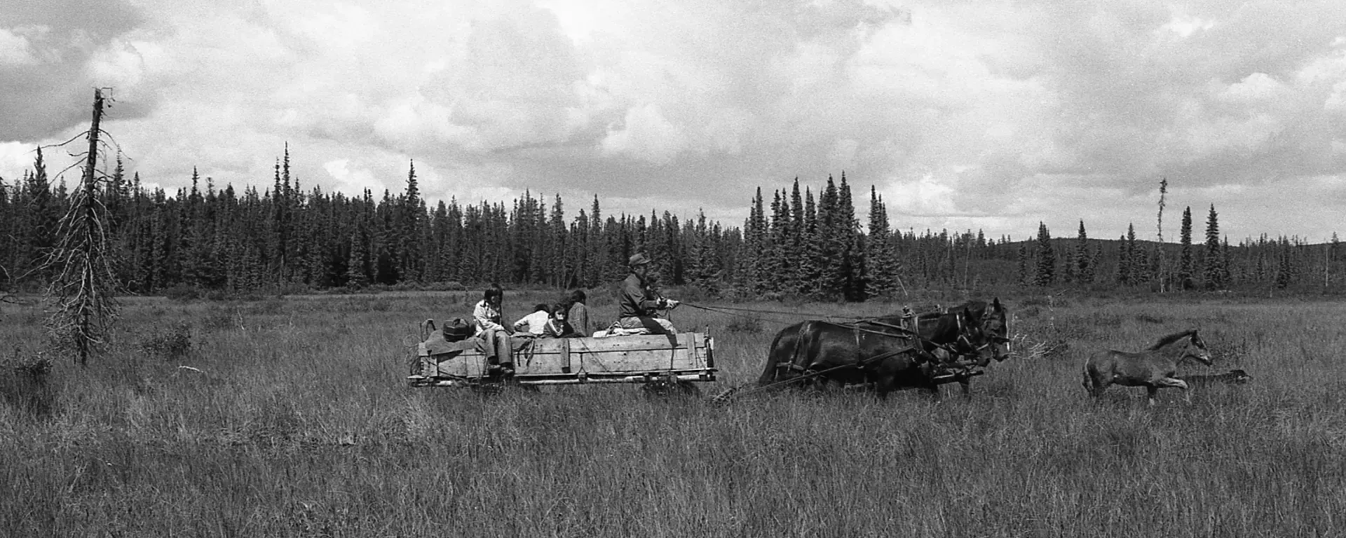 2016.3.1.68 Roy Alexis drives a horse-drawn wagon loaded with 4 passengers and supplies through a meadow. A young colt runs in front of the team of horses.